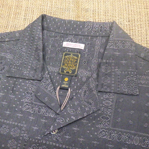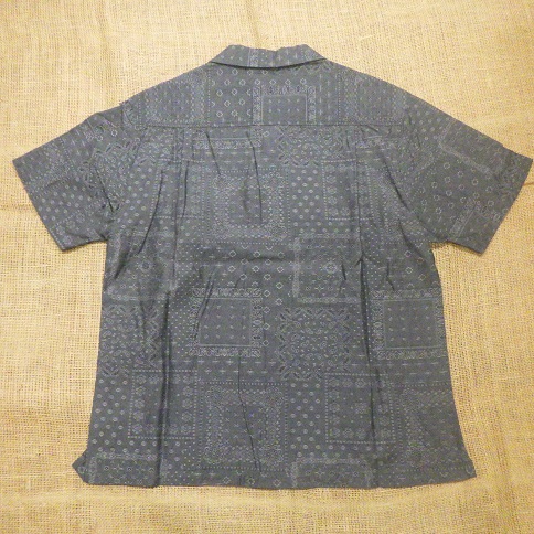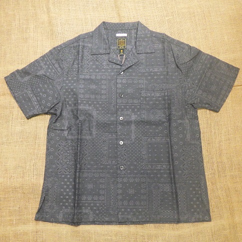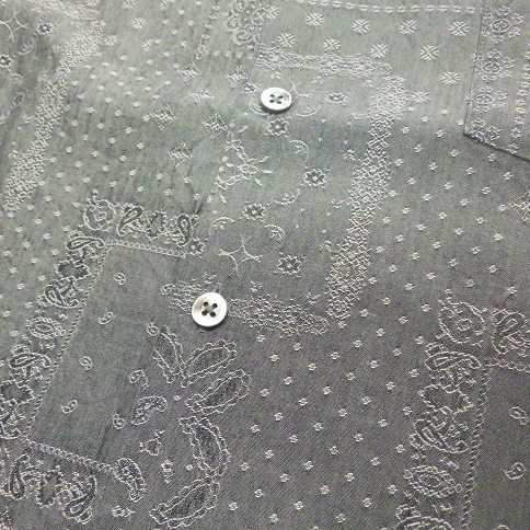 縦⽷にコットン、緯⽷にレーヨンを使⽤することでサラッとした落ち感があり、ジャガード織機でバンダナ柄を地柄に織り込むことによりシックなアメカジシャツに落とし込みました。ボタンは本⾙(⿊蝶⾙)仕様。