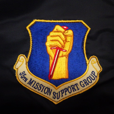 忠実さと目的の誠実さを象徴する盾に、「守るために攻める」というモットーを表した金の腕と赤い短剣が刺繍パッチで存在感あります。